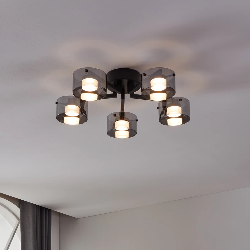 LED-loftlampe Copillos forener moderne design med funktionel belysning. Lampen er fremstillet af højkvalitetsglas og stål og præsenterer sig i en tiltalende kombination af røggrå glans og sort finish. De fem integrerede LED-lyskilder sikrer en jævn belysning og skaber en behagelig atmosfære med deres varmhvide lysfarve på 3.000 K. Takket være muligheden for at justere lysstyrken via en ekstern dæmper kan belysningen tilpasses fleksibelt til forskellige behov.