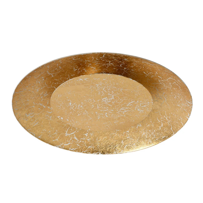 Rund LED-loftlampe Foskal, helt i messing og guld Den runde LED-loftlampe Foskal giver en særlig smuk indirekte belysning, da de varmhvide lysdioder er anbragt bag den runde plade i midten og spotlighter i retning af den buede loftsplade. Derfra reflekteres lyset nedad, hvilket skaber en meget behagelig og hyggelig belysning. Det runde metalarmatur med sin elegante messing- og guldfinish er også visuelt udsøgt og kan bruges i mange rum og indretningsstile, fra stuen til entreen.