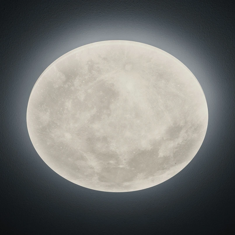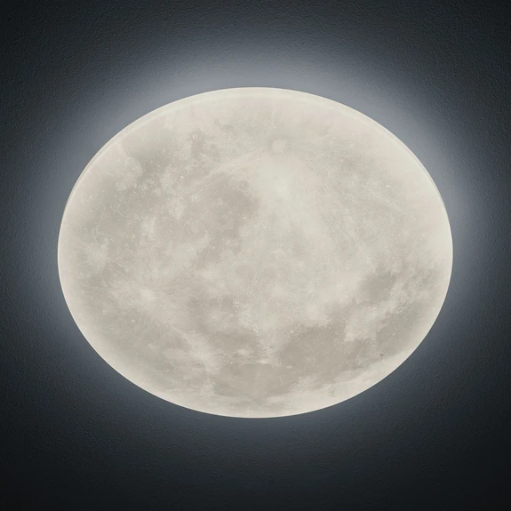 Cirkelrund som fuldmånen og minder også om månelandskabet strukturen på overfladen, sådan er LED-loftlampen Lunar designet. Den leveres med en infrarød fjernbetjening, som afgivelsen af lyset fra de integrerede, varmhvide LED’er bekvemt og fleksibelt kan styres med. Således kan man vælge forskellige månefaser på fjernbetjeningen (lyset stråler fra den ene side af lampen til den anden, cyklisk transformation - langsomt tiltagende lys, langsomt aftagende sænkning af lyse, lysets styrke kan reguleres, indstilles til natlysindstilling eller på 100 % lysstyrke).