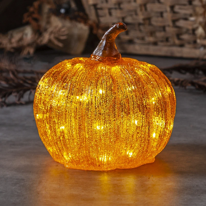 Dekorativ Harvey LED-terrasselampe med orange græskarformet lampeskærm Harvey LED-udendørslampen er designet i form af et græskar. Orange akrylelementer kombineret med LED-lyspunkter skaber en tiltalende gnist. Den drives af tre AA-batterier (eksklusive). Timerfunktionen (6 timer tændt, 18 timer slukket) muliggør automatisk skift.