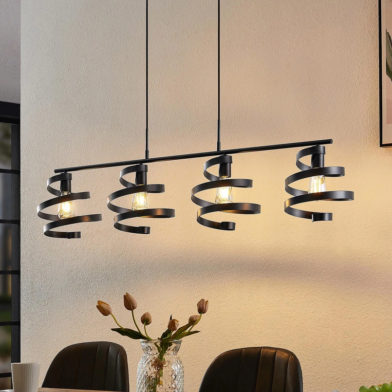 Fire-lys pendel Colten i stråleform med sorte spiralskærme, eksklusivt design