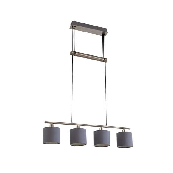 Den moderne hængelampe Jorin er perfekt over et langt spisebord. Den består af et stel i mat nikkel og fire lyskilder, der hænger ved siden af hinanden i form af små lampeskærme af stof. De gemmer hver især på en E14-fatning, der kan udstyres med den lyskilde, du foretrækker. For en optimal belysning kan du desuden højdejustere lampen via en enkel mekanisme, der indstiller ophænget fra 95 cm til 150 cm.