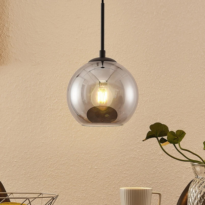 Sfærisk Jurian glaspendel med røget glasskærm og sorte detaljer Jurian imponerer med sit stilfulde look og er en pendel, hvor fokus primært er på skærmen af glas med en røget grå overflade. Den har et sofistikeret, ophøjet udseende og ligner en kugle med kun en lille åbning på undersiden til at skifte lyskilde. Lyset er varmt og hyggeligt, og lyskilden kan stadig ses tydeligt udefra, så den skal vælges med omhu som en del af helheden og helst have en dekorativ glaspære, som det f.eks. er tilfældet med effektive LED-pærer. Pendellampen ser også godt ud i en række over en disk og giver en stemningsfuld belysning med høj hyggefaktor.
