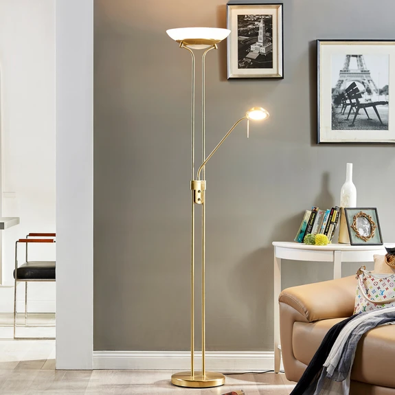 Messingfarvet Yveta LED-uplight med praktisk læselampe og to dæmpere Den, der vælger en messingfarvet lampe til sin bolig, følger som regel en lidt mere klassisk stil, når det gælder indretning. Yveta LED-uplight kan derfor også bruges smukt til at oplyse en klassisk atmosfære, da metalrammen har en helt messingfarvet finish. Den oversvømmelsesformede skærm på uplighten er lavet af hvidt glas med en blød alabastfarve og skaber, når den er tændt, et varmt, indbydende lys med en indirekte karakter. LED-uplighten fremstår derfor som en meget nyttig lyskilde, især til de hyggelige timer, hvor du læner dig tilbage og slapper af. Selvfølgelig tilbringer du mange hyggelige aftener i sofaen i blødt lys, men nogle gange sidder eller ligger du der også for at læse eller udføre en anden aktivitet, der ikke kun kræver fuld koncentration, men også tilstrækkeligt skarpt lys. Så kan du drage fordel af den integrerede LED-læselampe, der strækker sig fra Yvetas arm og projicerer mere ud i rummet. Læsearmen har to led, der giver mulighed for uendelig bevægelse, så du kan nå præcis det sted, hvor du har brug for det skarpe, centrerede lys. Det er tydeligt, at Yveta er en lyskilde, der allerede har en masse funktionalitet. De to dæmper, der er placeret på armaturets ramme, giver endnu større fordele, da uplightens og læselampens lysstyrke nemt kan styres - endda hver for sig! LED-pærerne er i sidste ende ansvarlige for at holde energiforbruget på et lavt niveau, selv om Yveta kan lyse rigtig stærkt.