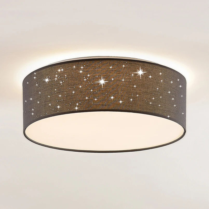 Smukke Ellamina LED-loftlampe imponerer med en glittereffekt Denne interessante lampe skiller sig ud takket være lampeskærmen, som er lavet af tekstil og designet i form af en cylinder. Den mørkegrå skærm passer godt ind i moderne møbler og har en glitrende overflade, der fanger øjet uden at være påtrængende. Denne effekt skabes af små, delvist stjerneformede udskæringer, og når lyskilden tændes, minder den om en romantisk stjernehimmel. En anden særlig egenskab ved LED-loftlampen Ellamina er den integrerede funktion, som ændrer lystemperaturen, så snart der trykkes flere gange på vægkontakten. Lyset kan justeres fra varmhvid til dagslys i tre forskellige niveauer. 3-Step-CCT + off ændrer lysfarven: Armaturets lysfarve kan ændres til tre forskellige niveauer ved at trykke på vægkontakten. 3-trins CCT-funktionen, som også omfatter slukning af armaturet, giver mulighed for følgende niveauer: 100 % lysstyrke ved 6.000 K, 100 % lysstyrke ved 4.000 K og 100 % lysstyrke ved 3.000 K