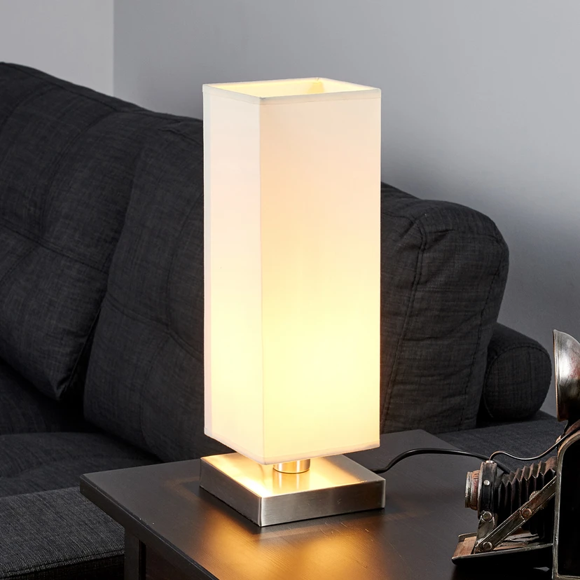 Kantet natbordslampe Martje med cremehvid stofskærm til E14-pærer Der skabes et smukt skær, når du tænder for denne natbordslampe, som selvfølgelig også er ideel som ekstra belysning i stuen eller entreen. Den kan placeres på et sidebord, en kommode eller i vindueskarmen og bliver et behageligt lyst fokuspunkt. Den kan monteres med E14-pærer.