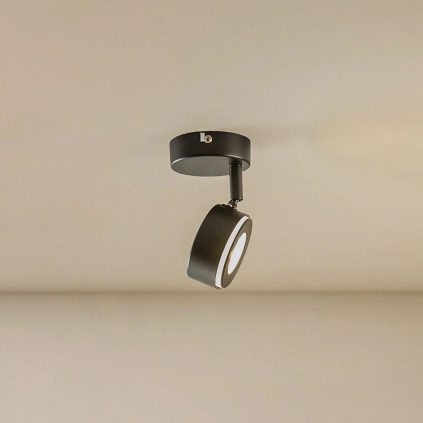 Sort Jyla-spotlight med justerbar skærm, dæmpbar Den enkeltflammede Jyla-loftspotlight er lavet af jern og giver omgivelserne et sofistikeret præg med sit sorte ydre. Samtidig passer den ubesværet ind i forskellige boligområder takket være sit diskrete design. Den er f.eks. ideel som lyskilde i entreen, køkkenet, stuen eller spisestuen. Den runde skærm kan justeres, så lyset kan rettes individuelt og give en optimal belysning af rummet. Lyskilden GX53 er inkluderet i leveringsomfanget, og lyset kan tændes og slukkes som normalt ved hjælp af en vægkontakt. Takket være 3-trins dæmpningsteknologien med integreret slukkefunktion kan den også dæmpes til tre forskellige lysstyrkeniveauer ved at trykke på kontakten flere gange: 100 %, 50 % og 12 %.