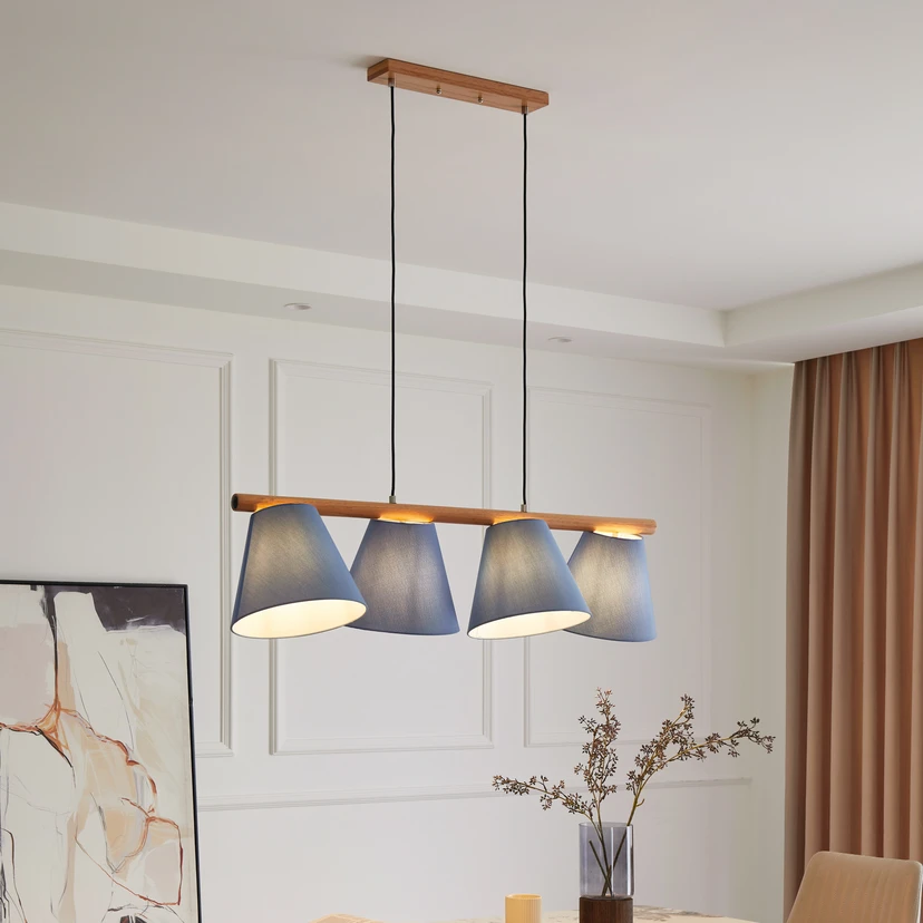 4 lyskilder, blå Jinda hængelampe med stofskærme og egetræ Den smukt designede Jinda hængelampe vil helt sikkert gøre en god figur i dit hjem. Lampen giver dig mulighed for at justere lysstyrken efter eget ønske ved hjælp af en ekstern dæmper. Lampen i nordisk stil, som er baseret på et koncept af Ingo Thiele, imponerer med mærkevarekvalitet fra Lucande og står derfor for en overbevisende boligoplevelse og fremragende design. Pendellampen i farverne blå og eg har E27-fatning. Den er ideel til din spisestue eller stue og har en dekorativ funktion, selv når den er slukket.