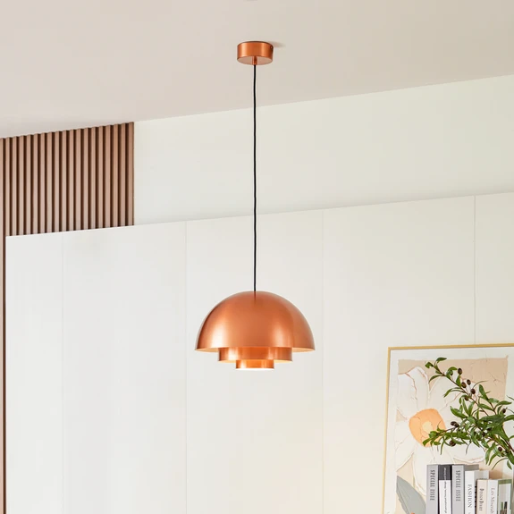Nymara LED-pendel i kobber med aluminiumsskærm Lad dig inspirere af denne smukt designede lampe. Alle Lucande-mærkets kvaliteter og højdepunkter er samlet i denne pendel. Lampen harmonerer med næsten ethvert interiør og er et højdepunkt i enhver stue takket være sin attraktive stil. Den udsender et smukt, varmt hvidt lys, som skaber en hyggelig atmosfære i din stue. Den messingfarvede lampe kan integreres perfekt i enhver indretningsstil og skaber en hyggelig atmosfære. Den imponerer med kvaliteten af det anvendte aluminium. Det vellykkede lys fra armaturet er ideelt til at fremhæve ethvert rum. Denne pendellampe udstråler en hyggelig atmosfære.