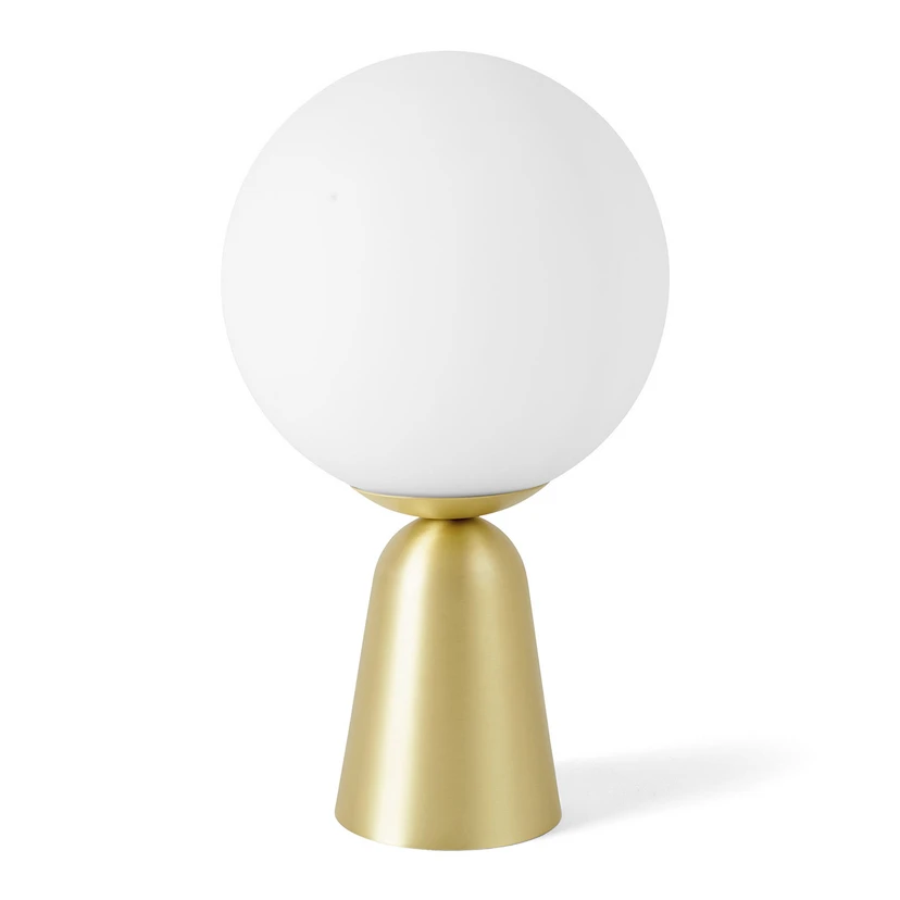 På vindueskarmen, sengebordet, på skænken eller på restaurantbordet ligner bordlampe et harmonisk og elegant tilbehør i et moderne design. Den sfæriske skærm lavet af blæst mælkeglas lyser rummet rundt med blødt lys, hvis lysstyrke kan reguleres via lysdæmperkontakten på kablet. Den koniske metalbase i mat messingfinish kompletterer bordlampe som en ædel detalje.