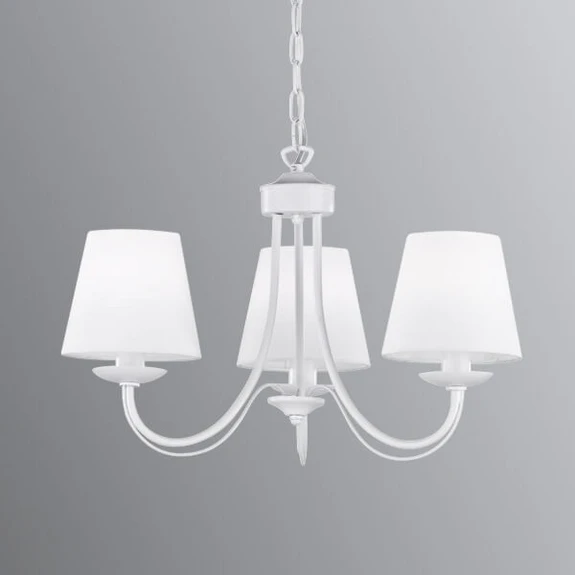 Tre smukt designede tekstilskærme i hvid pynter lysekronen Cortez. Stoffet sørger for en behagelig og stemningsfuld rumbelysning. Takket være dens design holdt helt i hvidt er den ikke kun en klassisk lyskilde, men også et moderne dekorationselement. Den vil stilfuldt passe ind i både rustikke og moderne boligindretninger og blive et sandt blikfang.