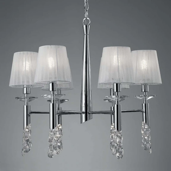 Designerlysekronen Lilja udstråler festlig pragt i et moderne boligmiljø Lysekroner er ofte udformet i en stil, der minder om tidligere tiders pragt og har til formål at bringe noget af den ind i nutiden. Det er meget anderledes med lysekronen Lilja af designeren José Ignacio Ballester. Takket være de delikate silkeskærme med deres skinnende lys og det glitrende krystalophæng mangler den intet i eksklusivitet og passer perfekt ind i denne moderne æra med sit komplette look. Lilja-lysekronen harmonerer med mange moderne indretningsstile i private hjem, restauranter og hoteller.