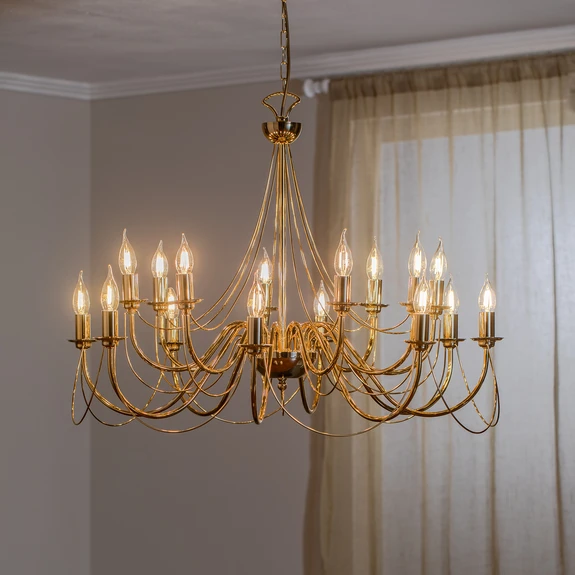 Lysekrone Retro, 16-flammet, i elegant guld, forener klassisk elegance med moderne alsidighed. Fremstillet af højkvalitetsstål, tilbyder denne lysekrone ikke kun et imponerende udseende, men også en langtidsholdbar og robust konstruktion. Den gyldne farve giver ethvert rum en varm og luksuriøs atmosfære, der kommer perfekt til sin ret i både stuen og spisestuen.
