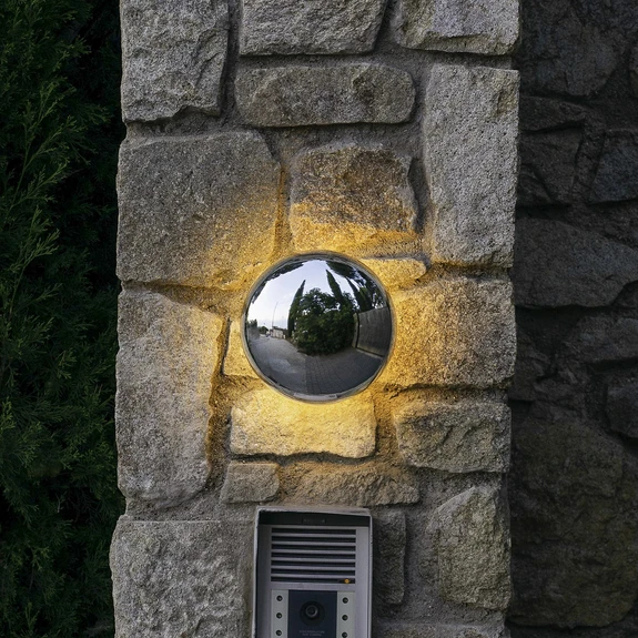 Runde udendørs LED-væglampe Babila i stål LED-væglampe Babila er fremstillet i poleret stål og er beregnet til udendørs brug, hvor den er optimalt beskyttet med IP65. Den moderne kugleform, hvor omgivelserne spejles, gør den til et enkelt, tiltalende belysningsobjekt til husfacaden, der tiltrækker opmærksomhed, selv når den er slukket. Babila giver en indirekte, blændfri belysning. Når lampen tændes, dannes der en lyskrans omkring det runde objekt, der omgiver lampen blidt og oplyser væggen rundt omkring med en diffus kontur. - dæmpbar med triac Designeren af denne lampeserie er Marco Zanuso Jr., der er født, bor og arbejder i Milano. Hans studio i Milano, der åbnede i 1991, fokuserer på produktdesign og arkitektur. Babila er produceret af den spanske producent Marset og udvider dermed udvalget af udendørslamper med et tidløst, holdbart produkt, der lever op til deres værdier. - kan også monteres som loftlampe