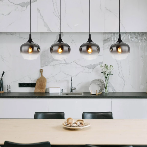 Maxy 4 lyskilder hængelampe med dekorativt farvet glas Den smukke Maxy hængelampe imponerer med sit flotte design. Fire glasskærme hænger ned fra en aflang baldakin, hvoraf nogle er røggrå transparente og nogle er klare. Det skaber en slående lyseffekt. LED-pærer med E27-sokkel anbefales som lyskilder på grund af deres æstetik og økonomiske energiforbrug - eksternt dæmpbar