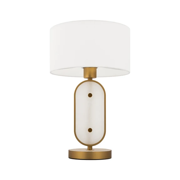 Marmo bordlampe af metal og natursten Marmo bordlampen er lavet af metal og natursten og har også en hvid stofskærm. Den aflange, flade stenplade har et dekorativt mønster og giver i kombination med den guldfarvede fod lampen et særligt elegant look. Takket være sit usædvanlige udseende er bordlampen et blikfang i stuen, selv når den er slukket. Marmo er en vidunderlig lyskilde til spisestuen, dagligstuen eller gangen. Lampen kan tændes og slukkes med en vippekontakt på ledningen.