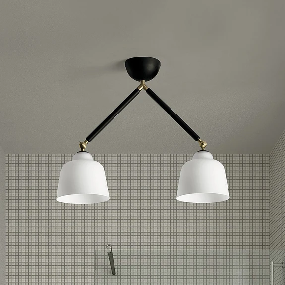 Justerbar Neoretro loftlampe med diffuser og to lampeskærme i frostet glas Neoretro loftlampen med sit karakteristiske design og materialesammensætning er enkel, men tiltalende. Den sorte metalkonstruktion består af en rund baldakin og to arme, der hver holder en konisk lampeskærm i frostet glas. I alt tre messingled gør det muligt at justere højden og skærmens position.