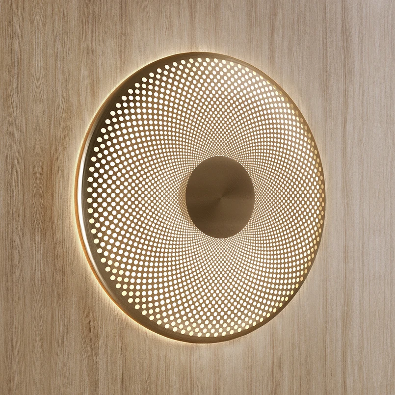 Design væglampe Glint med perforeret messingskærm - med afbryder, stik og stikledning