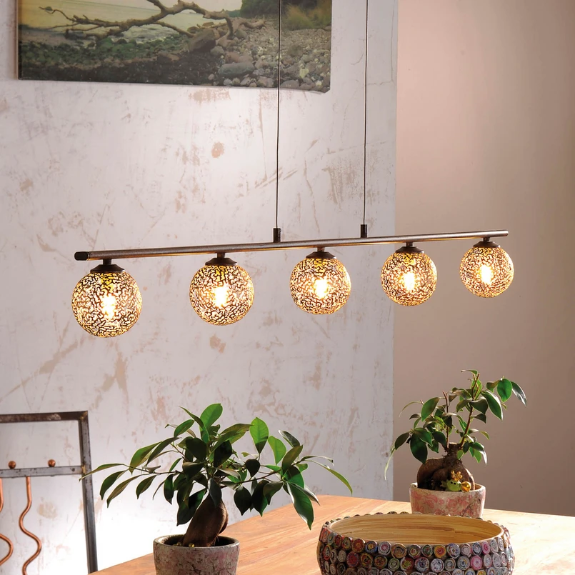 Greta - en hængelampe i en flot farvekombination Stål i rustlook og gyldne lampeskærme er en smuk kombination i hængelampen Greta, som ser meget hjemlig ud og kan integreres perfekt i en rustik-moderne indretningsstil med f.eks. naturtræer. De fem skærme, som er jævnt fordelt langs den 132 cm lange stang, er lavet af metal med heldækkende udskæringer og har en guldfarvet lakfinish. Lyset fra halogenpærerne spotlightes kun gennem disse udskæringer, hvilket skaber en fantastisk lyseffekt. Pærerne er ikke inkluderet.