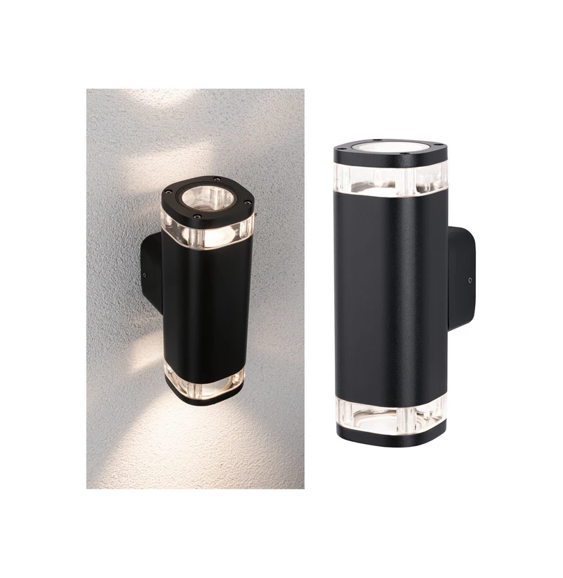Colum udendørs væglampe, to lamper, søvandsbestandig Colum udendørs væglampe har et lysudtag både opad og nedad, så lyset kan udsendes i en bred vinkel. Den transparente ring skaber også en smuk lyseffekt på facaden. Det havvandsbestandige armatur kan også modstå vejrforholdene i kystområder og kan monteres med GU10-lyskilder.