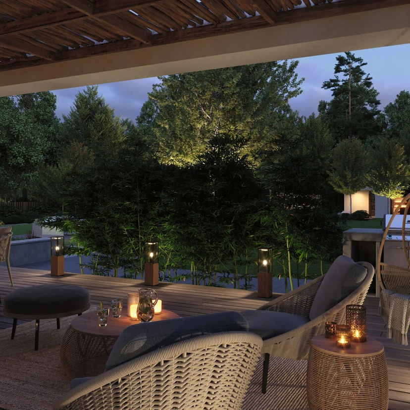 Timba-sokkelarmaturet præsenterer sig i form af en moderne lanterne med lige linjer. Den har sin særlige charme fra kombinationen af træ og sort metal, der danner en kantet lanterne som en åben kubus af stivere. Lanternen har en E27-fatning, som kan monteres med en pære efter eget valg. Lyset sendes ud til alle sider, så basisarmaturet oplyser terrasser eller stier sikkert. Samtidig gør det stilfulde design det til en smuk dekoration, selv når det er slukket