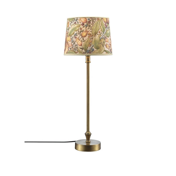 Liam-bordlampe i antik stil Denne bordlampe består af Liam-lampefoden af metal og Sofia-lampeskærmen af Theo-stof. Skærmen imponerer med sin farverige, spændende designede skærm i en beige grundfarve. Foden supplerer på den anden side dette med sit ret enkle, messingfarvede udseende.