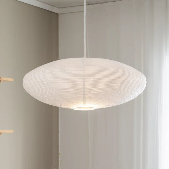 Elegant Yuni-pendellampe af rispapir Lampeskærmen på Yuni-pendellampen er lavet af rispapir, som er fastgjort til en tæt, uregelmæssig metaltråd, hvilket skaber et smukt mønster. Yuni er elliptisk i formen og har en diameter på ca. 60 cm. Den leveres med et hvidt ophæng og en baldakin, der harmonisk afrunder det samlede udseende af det skandinaviske belysningsobjekt