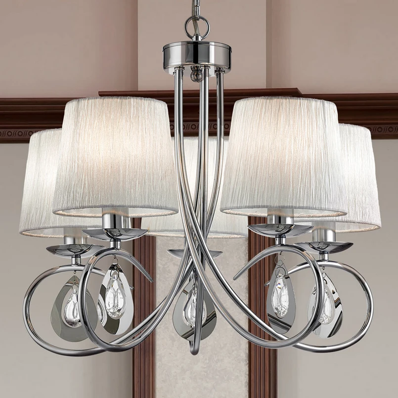 Ved den prægtige hængelampe Angelique er der forskellige faktorer, som gør den enestående. Der er for det første 5 bølgende med hinanden forbundne arme af krom på lampen med en ende formet som en løkke og med de tronende lampeskærme af stof. For det andet er der kromglas dråberne, som er placeret i løkkerne på armene og giver hængelampen en meget værdifuld karakter. I skærmene sidder E14-pærerne, som sørger for et hjemmeligt lys. Lampen anbringes i loftet med et kædeophæng, som fuldender det visuelle billede.
