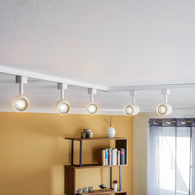 5 lyskilder Jorell 1-fase skinne i hvid med tre skinner Jorell er en komplet 1-fase skinne, der kan bruges både privat og kommercielt og er udstyret med tre skinner, fem cylindriske spotlights, en strømtilførsel, en endekappe og to I-forbindelser samt en L-forbindelse. Det betyder, at skinnerne også kan monteres rundt om hjørner. De fem spotlights kan tilsluttes skinnerne efter behov og kan udstyres med reflektorpærer efter eget valg, med forskellige lysfarver eller brede og smalle strålevinkler - alt efter hvad skinnesystemet skal bruges til, og hvilket formål det skal opfylde. Den hvide finish og de cylindriske spotlights ser meget tidløse ud.