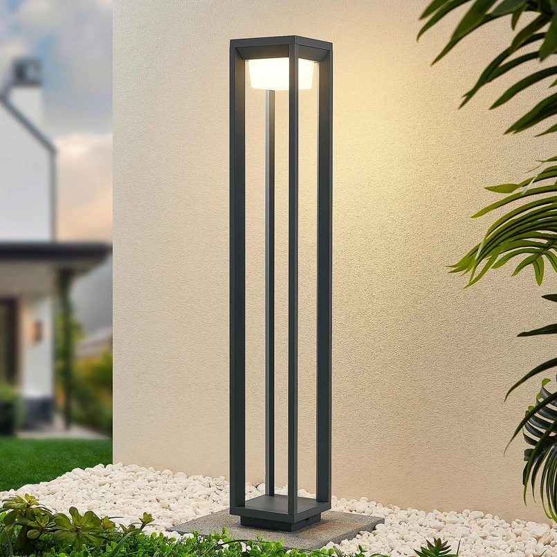 Moderne LED-gadelampe Gamion med kantet look Denne LED-gadelampe er særlig effektiv i årets mørke måneder, når den installeres i en række med flere lamper langs havestien. Når man kommer hjem om aftenen, vil man gerne blive mødt af et behageligt og varmt lys. Det giver Gamion LED-gadelampen med sit varmhvide lys, som er meget behageligt og indbydende. Det mørke og åbne design med slanke stivere passer perfekt ind i moderne omgivelser.