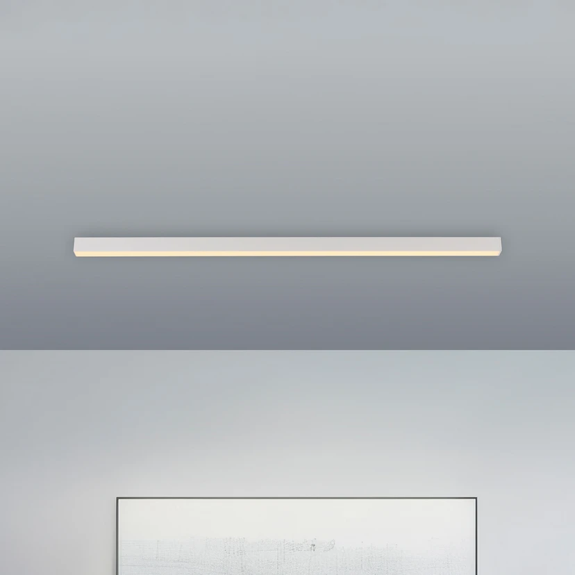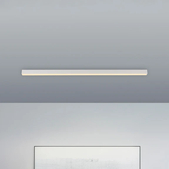 LED-loftlampe Pure-Lines tilbyder variabel justerbar belysning. Den er fremstillet i aluminium i en lang, smal form og udstyret med en diffusor af polycarbonat. Bag denne er der monteret LED'er, som kan styres meget bekvemt og utroligt fleksibelt via CCT-styringen og den medfølgende fjernbetjening. Lampen kan tændes og slukkes med fjernbetjeningen, den er dæmpbar, og lysfarven kan indstilles trinløst eller i fire faste trin. Derudover har fjernbetjening en knap til at slukke lampen efter et minut samt en knap til natlysfunktionen. Den indstillede belysning gemmes med hukommelsesfunktionen, så lampen lyser med den ønskede belysning, næste gang den tændes.