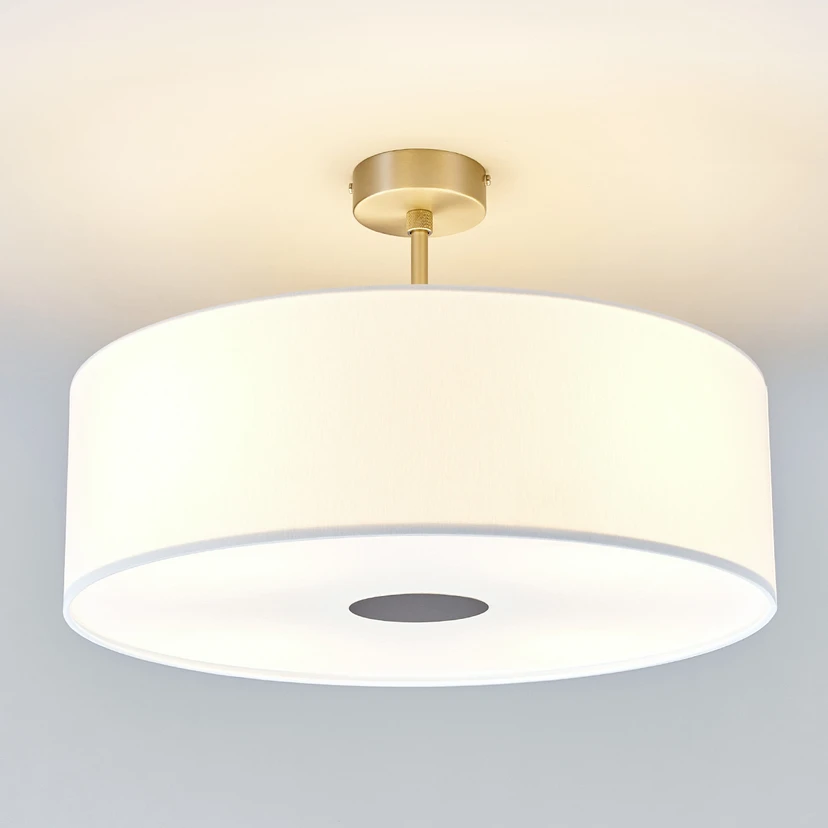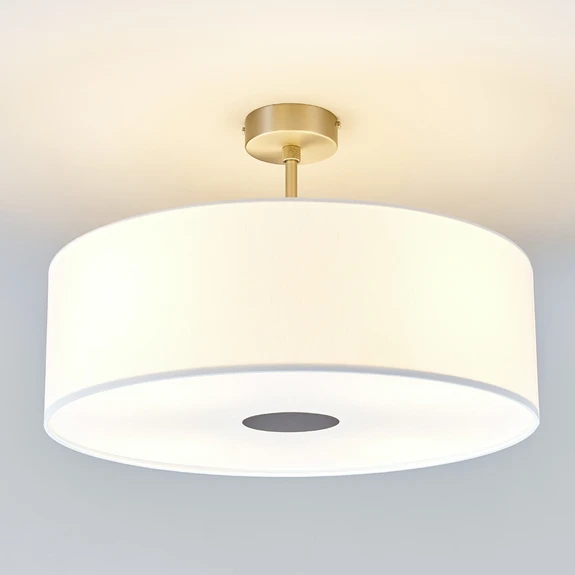 Flammehæmmende Gala LED-loftslampe med hvid chintz-skærm Vi forbinder farven hvid med renhed, elegance og lys. Armaturer i denne farve virker derfor umiddelbart lyse og rene. Gala LED-loftslampen skaber netop denne effekt, når dens varmhvide lys tændes. Det chintz-stof af høj kvalitet, som armaturets skærm er lavet af, imponerer med sin homogene lysfordeling og sin ensartede struktur. Det faktum, at Gala-skærmen ikke er placeret direkte på loftet, men lidt under det takket være et afstandsstykke, har også en positiv effekt på lyseffekten. Lyset kan spredes uhindret, ikke kun gennem den gennemsigtige chintz-afskærmning, men også som en indirekte glød mod loftet. En absolut sjældenhed i forbindelse med stofarmaturer er, at de er svære at antænde. Gala LED-loftslampen opfylder denne egenskab. Bærefilmen, som skærmen er belagt med, er svær at antænde og opfylder derfor kravene til byggematerialeklasse B1. LED-lyskilderne, der leveres med E27-fatning, giver en høj energieffektivitet. Men den, der foretrækker konventionelle lyskilder som gløde- eller sparepærer, kan nemt udskifte LED-lamperne med den ønskede type lyskilde.