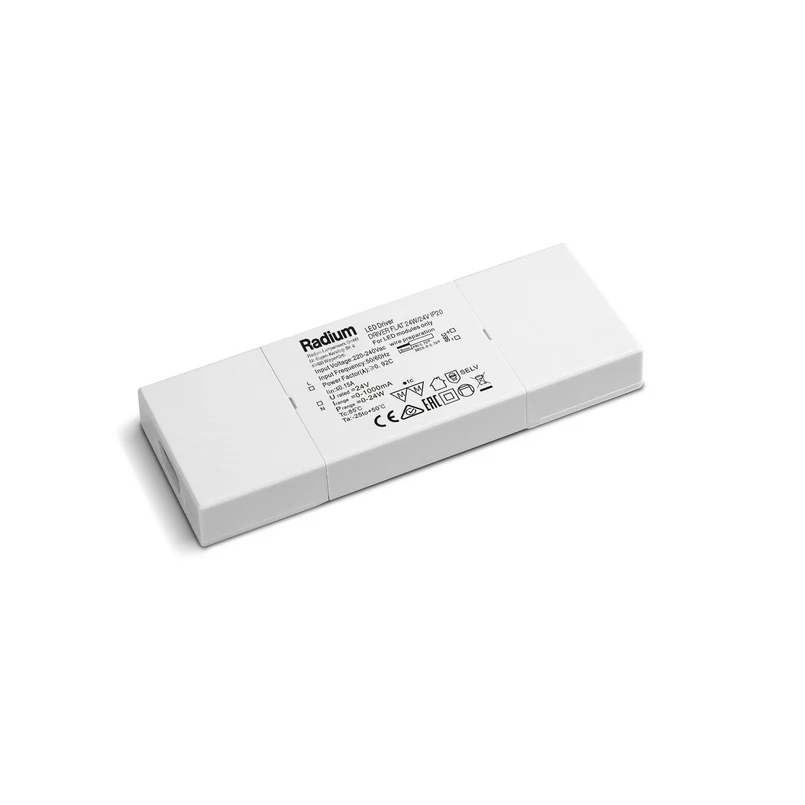 LED-driver Flat fra Radium til LED-strips, 24VDDette LED-kontroludstyr er beregnet som en kompakt konstantspændingsforsyning på 24V til drift af LED-moduler. Flat-serien fra Radium er beregnet til indendørs brug og fungerer som driver til hvide LED-strips.- ikke dæmpbar- til indendørs brug- tilslutningstype: fjederklemmer