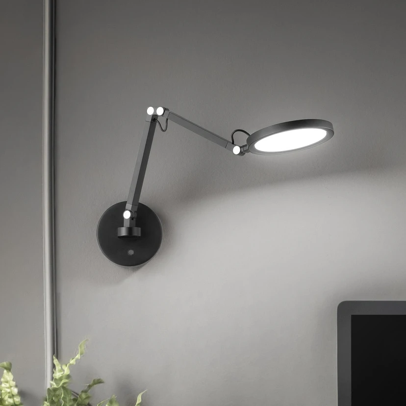 Fleksibelt justerbar LED-væglampe Regina med justerbar lysfarve Regina er en slank, sort væglampe med effektiv LED-teknologi. Den er lavet af metal og methacrylat og udstyret med praktiske samlinger, der muliggør fleksibel justering. Den har en praktisk berøringskontakt på rammen, som kan bruges til at justere både lysstyrken og lysfarven i fire trin. Den leveres også med et stik-kabel, så den kan betjenes via en stikkontakt som et alternativ til direkte ledningsføring.