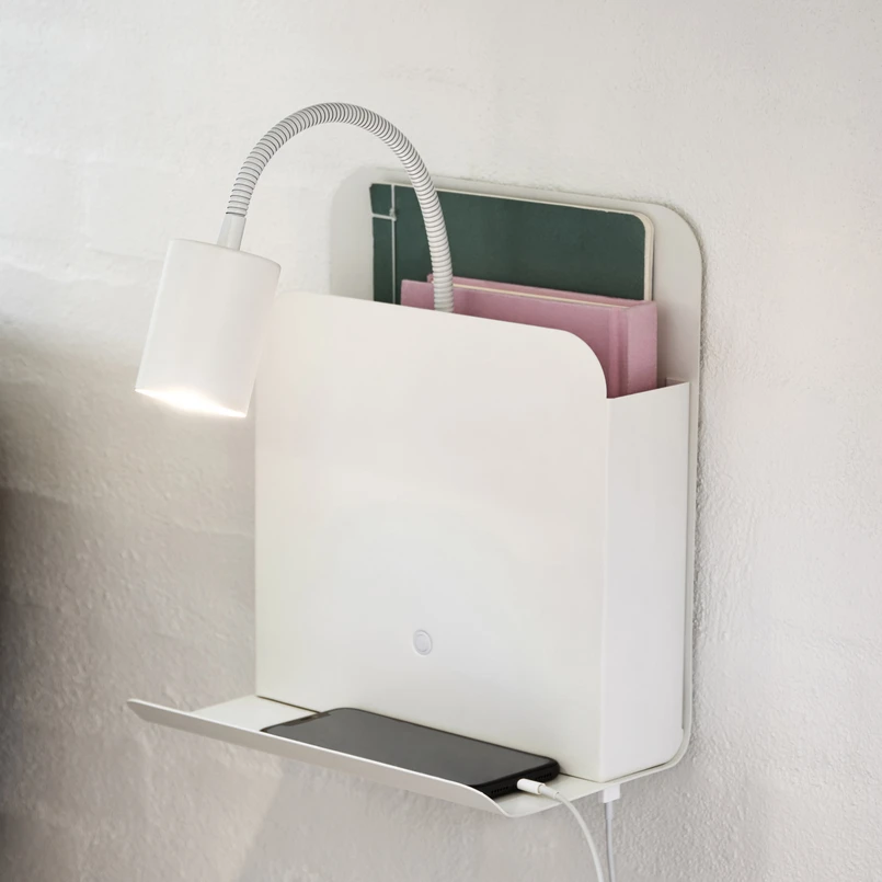 Roomi væglampen har mange fordele, da den indeholder mange nyttige funktioner, der er særligt effektive ved siden af sofaen eller sengen. For det første kan lyskilden og dens kegle justeres fleksibelt. Et rum bagved kan hurtigt opbevare notesbøger eller magasiner. Roomi har desuden en USB-port og en hylde, hvor f.eks. en mobiltelefon kan oplades og opbevares. Alt i alt passer Roomi ikke kun ind i dit eget soveværelse, men er også meget praktisk i hotel- og gæsteværelser og er meget let at integrere takket være det monokrome design.