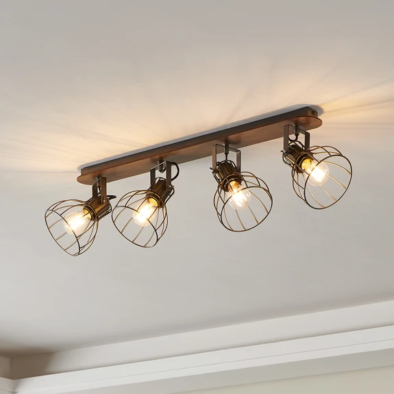Sambatello loftslampe i brun og sølv Sambatello loftslampen er et ægte blikfang. Det moderne industrielle design giver dette belysningsobjekt det helt rigtige særpræg. De fleksible samlinger af de fire fatninger muliggør en optimal belysning og giver dermed individuelle lysaccenter. Lampen er fremstillet af stål og træ og er fastgjort direkte til loftet med ophæng. Særligt tiltalende er dens enkle farvesammensætning i brun og sølv. De tynde stålstrenge på de fire lampeskærme i burdesign supplerer det minimalistiske design. Dette suppleres af det behagelige lysbillede til et sammenhængende helhedsbillede.