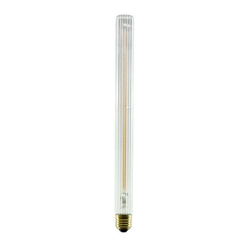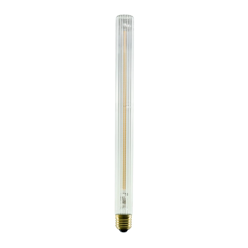 LED-pære E27 T35 4,5W i lang rørform med riflet glas Denne LED-pære fra Soft Line-serien fra Segula har en usædvanlig, lang rørform lavet af gennemsigtigt glas med en fin riflet struktur. De fleksible LED-tråde ligner til forveksling glødetråde og spotlighter et varmt og blændfrit lys. Den lange LED-pære er ideel til dekorative belysningsopgaver i skærmløse armaturer og kan dæmpes med de fleste kommercielt tilgængelige lysdæmpere - ekstra varm lysfarve (2.200 K) - dæmpbar med de fleste kommercielt tilgængelige lysdæmpere - særlig god farvegengivelse (Ra >90) - meget lang holdbarhed på antal tænd/sluk (100.000 cyklusser)