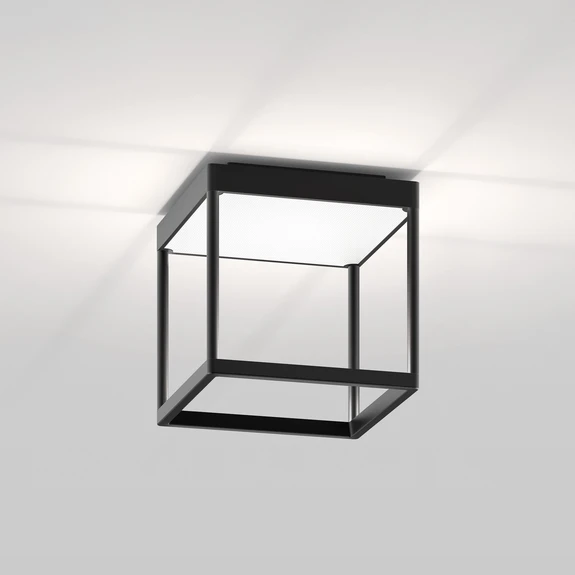 Reflex² S LED-loftarmatur designet som en åben kubus, 2.700 K, eksternt dæmpbar via Triac, grundflade 20 cm x 20 cmLoftarmaturet Reflex² S LED-loftarmaturet er designet af Jean-Marc da Costa, en af grundlæggerne og direktørerne for serien.lighting. Dens åbent designede ramme med fine stivere er fremstillet af aluminium. LED'erne er integreret på oversiden af de nederste stivere bag fladt glas og lyser op mod loftet, hvor lyset falder på en prismatisk reflektor af plexiglas.Der er installeret LED'er af høj kvalitet fra fabrikken, som giver varmt hvidt lys med god farvegengivelse. Lysstyrken kan også dæmpes eksternt via en triac.