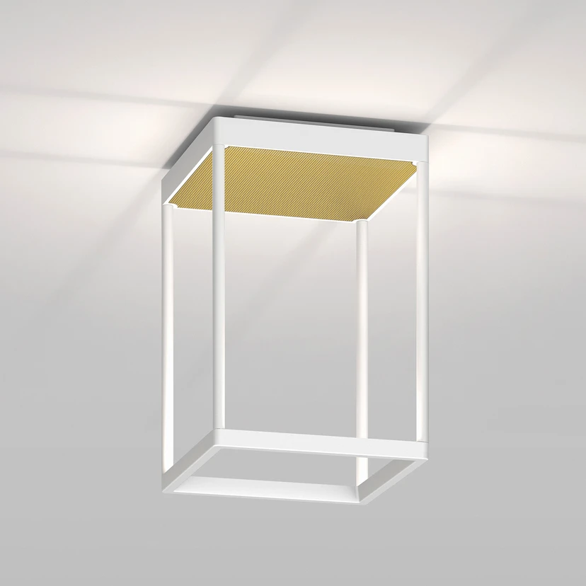 Reflex² S LED-loftarmatur designet som en åben kubus, 2.700 K, eksternt dæmpbar via Triac, grundflade 20 cm x 20 cmLoftarmaturet Reflex² S LED-loftarmaturet er designet af Jean-Marc da Costa, en af grundlæggerne og direktørerne for serien.lighting. Dens åbent designede ramme med fine stivere er fremstillet af aluminium. LED'erne er integreret på oversiden af de nederste stivere bag fladt glas og lyser op mod loftet, hvor lyset falder på en prismatisk reflektor af plexiglas.Der er installeret LED'er af høj kvalitet fra fabrikken, som giver varmt hvidt lys med god farvegengivelse. Lysstyrken kan også dæmpes eksternt via en triac.