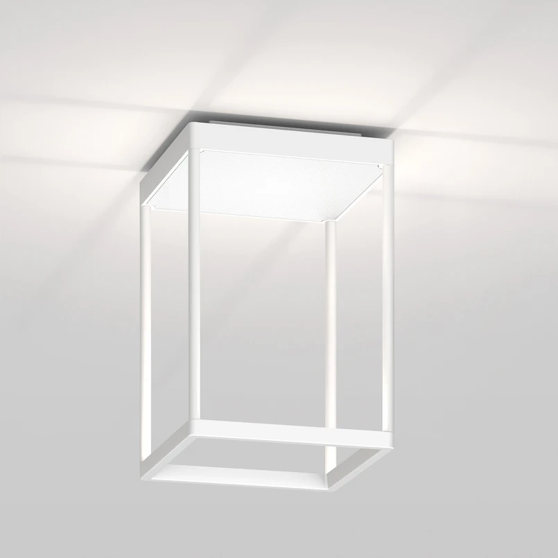 Reflex² S LED-loftarmatur designet som en åben kubus, 2.700 K, eksternt dæmpbar via Triac, grundflade 20 cm x 20 cmLoftarmaturet Reflex² S LED-loftarmaturet er designet af Jean-Marc da Costa, en af grundlæggerne og direktørerne for serien.lighting. Dens åbent designede ramme med fine stivere er fremstillet af aluminium. LED'erne er integreret på oversiden af de nederste stivere bag fladt glas og lyser op mod loftet, hvor lyset falder på en prismatisk reflektor af plexiglas.Der er installeret LED'er af høj kvalitet fra fabrikken, som giver varmt hvidt lys med god farvegengivelse. Lysstyrken kan også dæmpes eksternt via en triac.