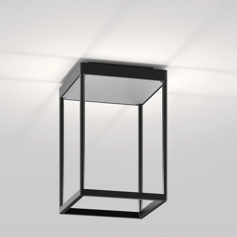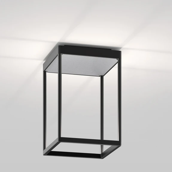Reflex² S LED-loftarmatur designet som en åben kubus, 2.700 K, eksternt dæmpbar via Triac, grundflade 20 cm x 20 cmLoftarmaturet Reflex² S LED-loftarmaturet er designet af Jean-Marc da Costa, en af grundlæggerne og direktørerne for serien.lighting. Dens åbent designede ramme med fine stivere er fremstillet af aluminium. LED'erne er integreret på oversiden af de nederste stivere bag fladt glas og lyser op mod loftet, hvor lyset falder på en prismatisk reflektor af plexiglas.Der er installeret LED'er af høj kvalitet fra fabrikken, som giver varmt hvidt lys med god farvegengivelse. Lysstyrken kan også dæmpes eksternt via en triac.