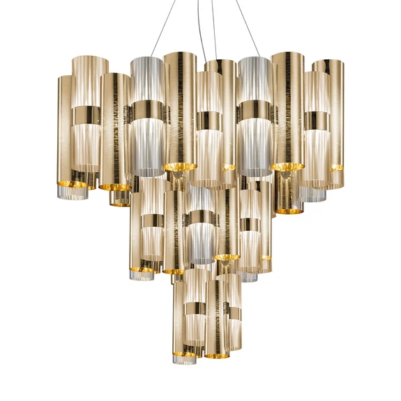 På tre niveauer er de cylindriske elementer placeret i forskellige omkredse rundt om en LED-ring indeni. Cirklerne bliver smallere fra top til bund, hvilket skaber en uforlignelig lyseffekt. Hver smal, aflang cylinder er omgivet af et diskret bånd, der skaber et visuelt højdepunkt. De er også åbne i top og bund, og deres beskaffenhed giver mulighed for 360° lys.