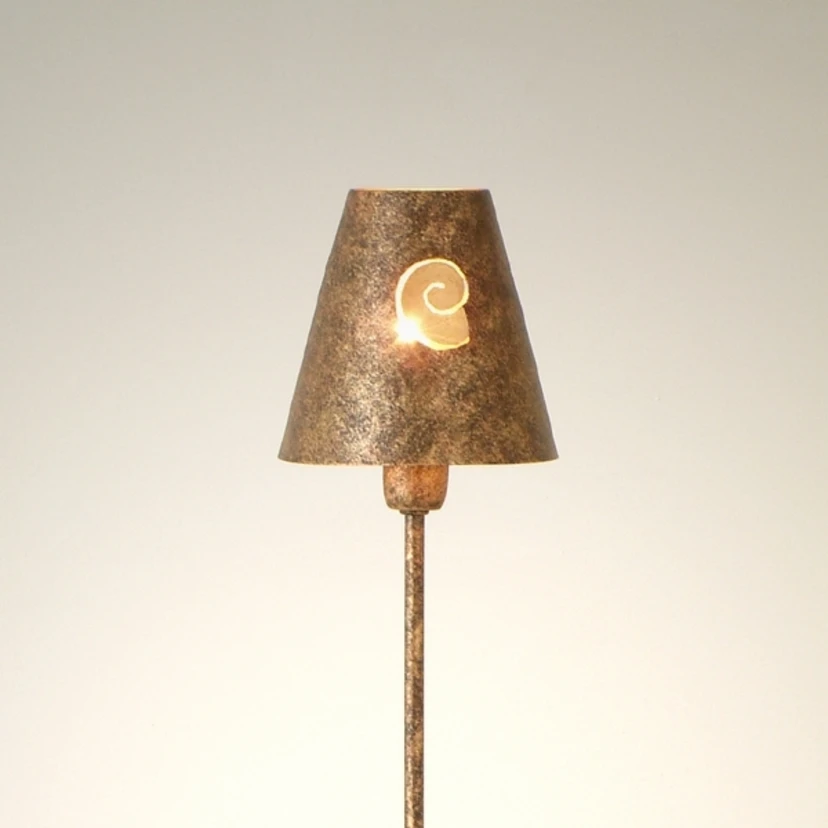 Den elegante bordlampe ESEMPIO er udstyret med en slank jernstav som fører op til lampeskærmen. Den flotte metalskærm er prydet med spiralformede dekorationer, som lyser effektivt op så snart bordlampen tændes.