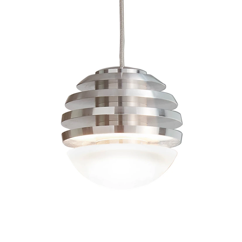 Bulo Micro sfærisk LED-pendel med touch-dæmper Oliver Niewiadomski designede denne ekstravagante pendel for belysningsproducenten Tecnolumen for at kombinere førsteklasses design med den nyeste teknologi. Bulo Micro-armaturet er en del af "Bulo"-serien, hvis udseende er kendetegnet ved en snoet aluminiumskrop, mens lyset kan glide gennem den satinbelagte lampeskærm. Det er kendetegnet ved brugen af materialer af høj kvalitet i kombination med den nyeste LED-teknologi. Den ønskede farveintensitet kan vælges ved hjælp af touchdæmperen, der er integreret i lampeskærmen.
