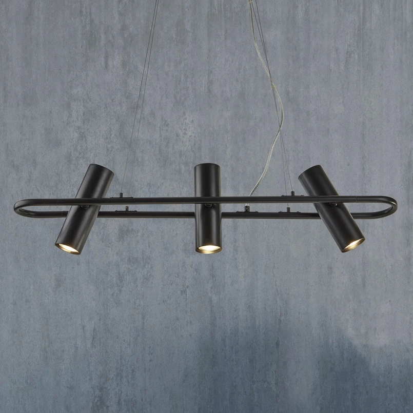 1970'ernes charme bevæger sig ind i hvert rum med dette tre-lampe-teleskop-pendel. Den mattsorte lakerede lampe består af en metalramme med afrundede ender, hvori der er tre lange spotlights. Takket være svingbarheden kan disse justeres målrettet for effektivt at belyse et langbord.
