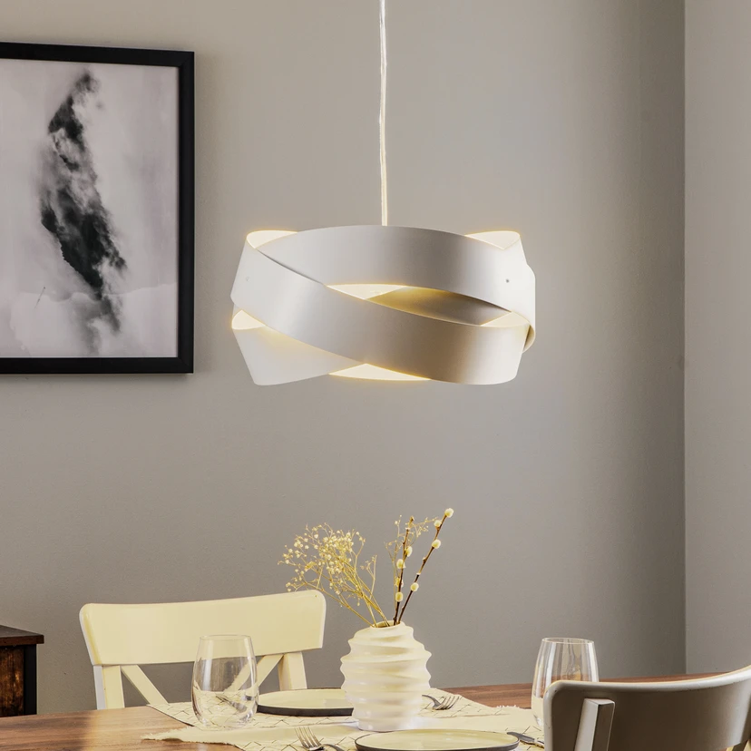 Designet af denne pendellampe kombinerer tidløs elegance og moderne design. Den består af et rundt loftsbaldakin og en 100 cm lang ophæng, som lampeskærmen er fastgjort til. Ligesom loftet og stangen er skærmen lavet af hvidlakeret metal, hvilket giver det generelle udseende en vis lethed. Pendelarmaturet er primært velegnet til belysning af borde eller diske. Den lyskilde, der skal bruges, kan fås via tilbehøret.