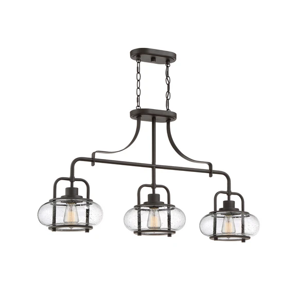 Antikdesignet Trilogy-pendelarmatur - tre lamper Trilogy-pendelarmaturet med tre lamper vækker nostalgiske minder: det giver associationer til en svunden tid, og derfor passer det perfekt til en atmosfære i antik stil. Stålrammen er lakeret med en antik bronzefinish, og skærmens klare glas er forsynet med en dekorativ struktur, der giver en særlig flair til det udsendte lys. Armaturet ser særligt autentisk ud, når der bruges Rustika- eller glødelamper. Pære medfølger ikke - kan købes separat via tilbehør