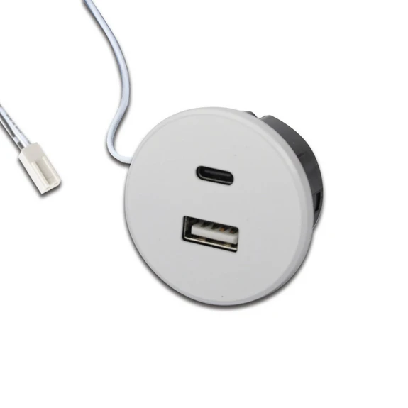 Rund indbygningsstikkontakt med USB-A- og USB-C-udgang, tilslutning med Hera LED 24-stik Denne stikkontakt med rund plastramme er designet til installation i møbler og paneler. Den er udstyret med en USB-A-udgang og en USB-C-udgang og muliggør dermed opladning eller betjening af enheder (f.eks. smartphones), der forsynes med 5 V. - Tilslutningskabel 250 cm med Hera LED 24-stik - Kræver transformer med Hera LED 24-udgang og 30 W til 200 W (se tilbehør)